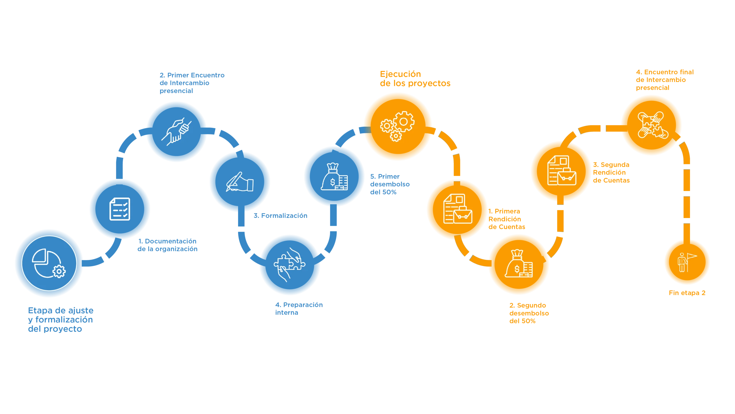Este recorrido presenta los pasos que siguen después de que un proyecto es seleccionado. Avanza paso a paso y, en cada etapa, despliega los acordeones para encontrar explicaciones claras y los documentos necesarios.